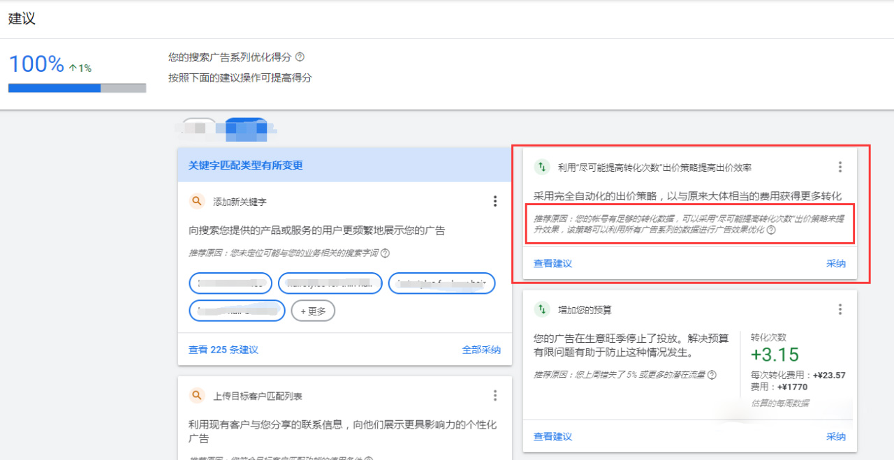 2. 當我們的廣告系列有了歷史轉化數據(月轉化數據>30)時(shí),Google Ads 系統會(huì )自動(dòng)建議使用智能出價(jià)策略,例如盡可能提高轉化次數,目標每次轉化費用等。(關(guān)于智能出價(jià),你可以看:《自動(dòng)化時(shí)代-最大化廣告效果Google,智能出價(jià)你了解并設置正確了嗎?》)。