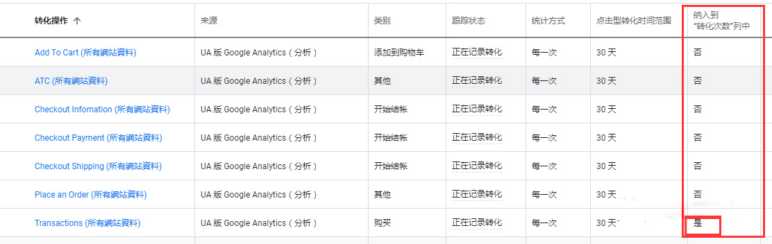 還是拿這個(gè)賬戶(hù)舉例,用戶(hù)購買(mǎi)是我們的最終目標,所以我們只把購買(mǎi)這一項設置進(jìn)轉化次數列中。