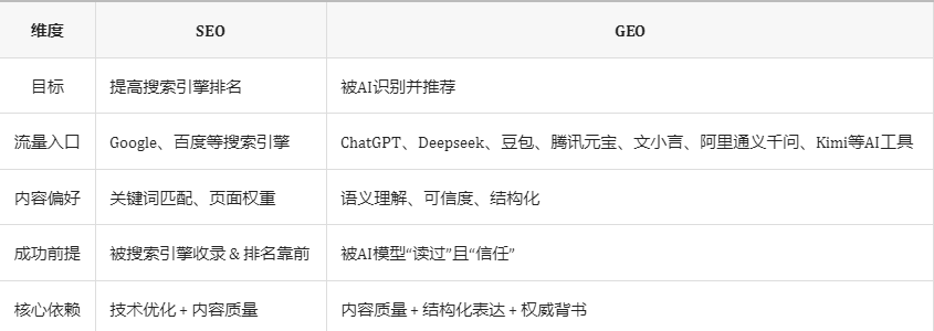 SEO和GEO的核心差異,一張表說(shuō)清楚